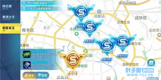 在街区界面中,车手会看到自己所在的城市地图,并且在地图上能够看到可挑战的赛场及附近车手。