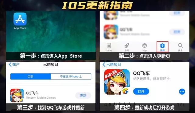 1.更新下载之前,请确保手机内存足够,否则会导致安装失败。 2.在版本更新时,如遇到无法更新、循环出现更新提示而无法更新时,请尝试 切换网络运营商 (如WiFi切换成4G)并等待几分钟后再进入游戏进行更新。 3.部分iOS用户可能会遇到 App Store更新按钮未刷新、下载缓慢 等问题,是由于App Store服务器延迟导致,遇到问题的车手们可通过下图中的方式尝试更新: