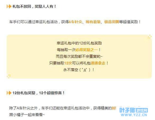 全新A车针尖首发,幸运礼包活动登场,点券参与必得永久。字里行间总觉得透着丝丝诡异,按照天美往常的尿性,总感觉在玩文字游戏,点卷参与必得A车针尖?总感觉必得的不是A车,而是发饰、衣服、首饰的一些其他的物品。