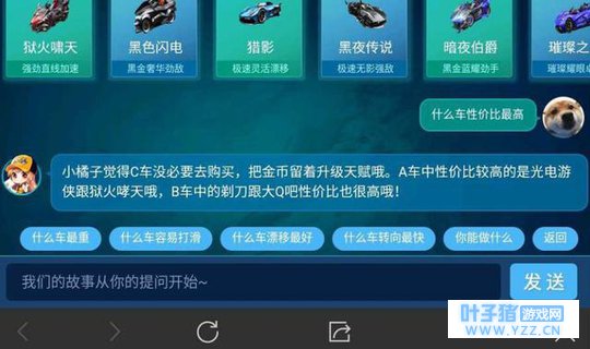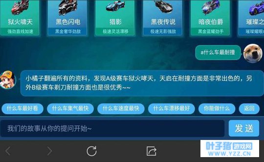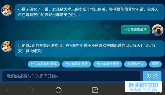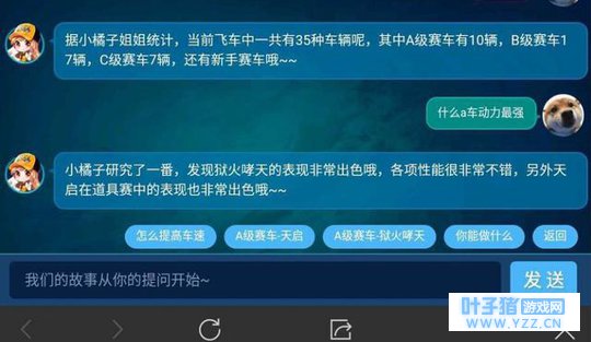 哈喽大家好啊,今天小白给大家带来手游飞车的小资讯了!最近飞车手游出了一个可以直接问话小橘子的功能,大家所问的所有问题都能回答,除了不能透露的消息,其它都可以问得到!所以就有调皮的网友去套路小橘子了,不仅问出最强A车,还大概可以猜测出下一辆即将返场的A车!