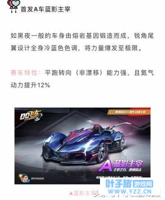 好了,该来介绍一下特性了,A车蓝影主宰,跟爆料站出来的完全不一样,但是这个特性更让人惊喜,平跑转向能力强(天启的第三代特性),且氮气动力提升12%,特性蓝影主宰就占了两个竞速的BUG级特性,转向降速对于很多车来说都是非常不友好的,但是目前有三辆车是例外,A车天启还是赛场上的常驻车,B车霸天虎就不讲了,直接上升到了B车最强的地位,那么这蓝影主宰能强到什么地步?光从特性上,就已经赢了一半。 特性解析:转向的不谈,大家都懂,主要是氮气动力提升12%,动力其实就是指提速的意思,不影响最高速,但是动力强,提速快,可以更快的达到最高速。两个都是竞速实战的BUG特性,确实有点BT了。