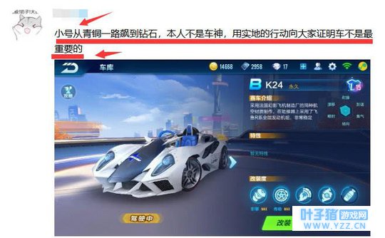 今天小编就来跟大家讲一位玩家上钻石的故事!这位玩家没有A车也没有氪过金,他是全靠一辆B车K24上的钻石!用自己的小号从青铜一路狂飙到钻石,很多人有可能会认为他是开挂了,或者有比其它人好的赛车,其实这部是的这位玩家也不是车神,他是用了自己的实际行动向大家证明了赛车不是最重要的!