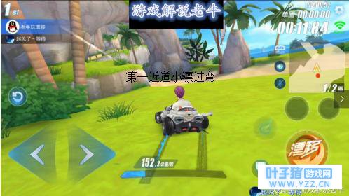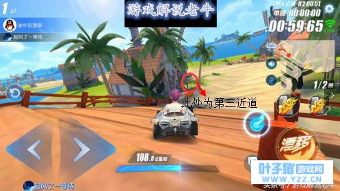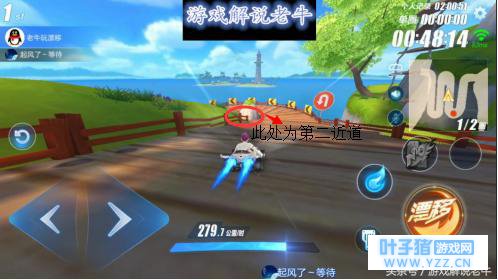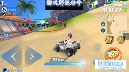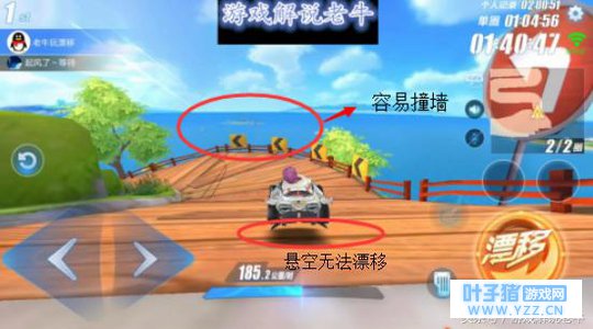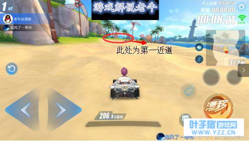 穿过拱桥后,海滩变得不平坦,但坡度不大,形成不了落地喷。然后进入第一个弯道,并且在角落处有一个不小的缺口,这是近道,小漂容易过弯还有不错的集气效果。这里的道路不平坦,会有一个落差,能形成一个空喷。 【减速过弯】