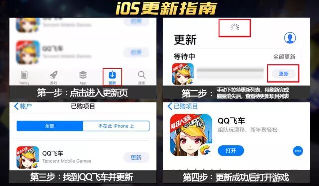 5. iOS 下载缓慢、更新按钮长时间不刷新怎么办? 请点击进入App Store,点击右下角更新按钮进入 更新页签 , 手动下拉 待更新项目列表, 刷新页面 ,等待刷新完成 圈圈消失 后,在列表中找到《QQ飞车》并点击更新。