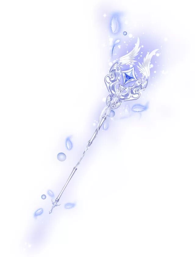 雪凝冰羽手杖 剔透的手杖仿似冰晶打造而成,杖心的蓝宝石璀璨而美丽。轻柔的飘羽萦绕于杖身,萤光似雪,熠熠生辉。