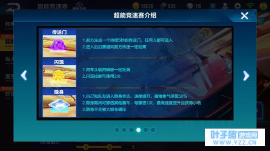 手游QQ飞车最近更新了一种新的模式——超能竞速,可以理解为在普通竞速模式中加入了超能力,目前这一模式有变大、飞行、隐身、穿越、闪现这五种超能力。