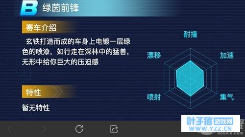 耐撞:☆☆☆ 在游戏中,耐撞属性决定了赛车在赛车场上的表现,对于玩家来说还是非常重要的,绿茵前锋这辆赛车虽然在很大程度上比不上顶尖B车,当是想要撞飞它相对来说难度还是比较大的。 集氮:☆☆☆ 集氮能力上,这辆赛车表现的也是较为一般,赛车的进气效率和集氮能力都是B车当中的平均水平,所以在这一方面并没有优势,不过如果改装之后的话,用来跑图的优势还是很大的。