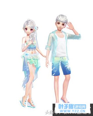 ▲ 泡沫之夏套装 夏日来临开启了最美的季节,繁花灿烂,海洋清爽,一切都显得那么美好。泡沫之夏套装以清凉的海蓝色与绿色为基调,女生的薄纱比基尼展示出美好修长的身材,搭配花朵配饰,性感而妩媚。男生以休闲的短裤搭配清爽的防晒衫,时尚而充满运动感。