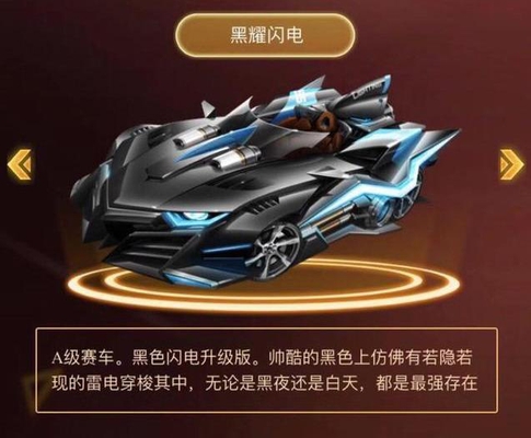 下面在来看看周年庆要上架的赛车,首先上架的赛车是黑耀闪电,是一辆A级赛车,是黑色闪电的升级版,这辆赛车在之前官方的活动调查问卷里面有提到过的,问大家对于这辆车怎么看,这是为现在的出现埋下了伏笔呀,黑耀闪电更像是黑色闪电和凌霜风暴的结合体,那肯定不会是点券车了,因为它的获取方式可能是通过升级黑色闪电来获得。