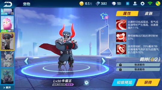第三个小宠就是牛魔王了,牛魔王的特性使用双喷时,25%概率7秒内撞墙集气保护30%且氮气动力提升10%,虽然触发的概率比较感人,但是触发之后的氮气动力提升就会很恐怖了,所以这个宠物还是一个比较值得氪的一个宠物。牛魔王的推荐搭配赛车为破晓者,双双特性合璧,必定一骑绝尘。