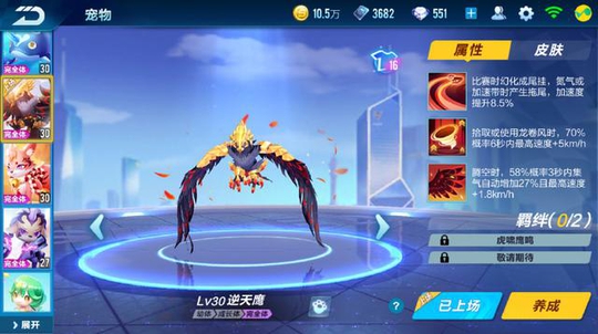 第四个就是逆天鹰了,逆天鹰从刚开始上架的时候300点券一个蛋,到现在降价到200点券一个蛋,虽然价格降低了,但是其热度不减,一直被玩家尊称为最强平民宠物,特性是腾空时,58%概率3秒内集气自动增加27%且最高速度+1.8km/h.而且还没有CD时间。虽然比不上钻石神宠,但其自动集气的能力和优惠的价格,也算是宠物中比较不错的了。推荐搭配的车子大家想必都知道了吧,那就是飞跃了,最强平民宠物加上最强平民赛车,特性方面又是如此的相似,叠加之后根本不需要卡气了,平民玩家首选。