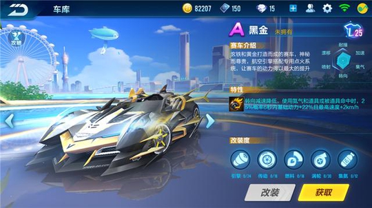 赛车简介 玄铁和黄金打造而成的赛车,神秘而尊贵,航空引擎搭配专用点火系统,让赛车的动力得以最大的提升。黑金耐撞、加速和转向性能优秀,是一辆综合性能很强的A车。