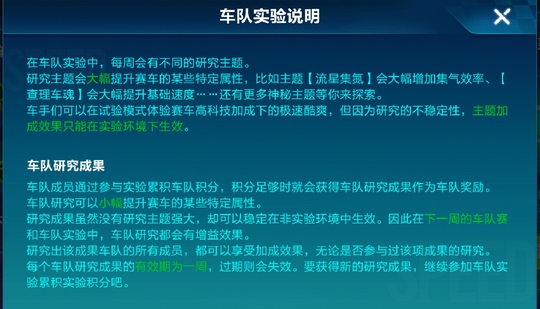 其实很简单。你可以把每周研究主题看成一个超强的赛车特性。 每周,给你1个超级特性在赛车实验室玩。只要你们车队凑够了240分。 那么第二周全车队,在车队赛跟实验室,会有1个削弱版的同类型特性。 也就是说,第二周车队实验室,你其实是同时拥有2个特性的。 本周的特性是风灵转向