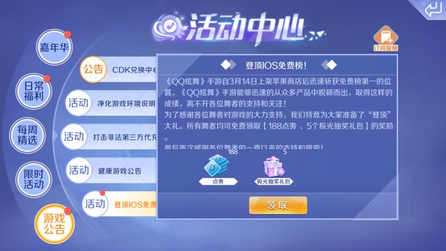 只需要进入游戏,在 活动中心-游戏公告-登顶iOS免费榜公告 内即可领取“登顶”大礼—— 188点券 和 5个极光抽奖礼包 ! 如果只是这样,还不足称为惊喜~今天除了刺激的 嘉年华活动 ,星瞳姐姐还闹了个 “超闪耀”的大资讯 !下面有请星瞳姐姐开始她的表演↓↓↓ 臻品·圣灵天使 哈啰,dancer们,请注意保护眼睛,因为—— 耀眼的圣灵天使降临! 公众号菜单栏发送“大天使” 即可获取高清海报 纯白的羽翼在风中摇曳,金色的发梢与权杖交织,如精灵般纯净的脸庞不食人间烟火...... 臻品 套装 ·圣灵天使 将在 明天上午10点 (3月17日)降临炫舞世界! 刚得知这个消息,星瞳可是震惊的连小饼干都掉了...然而这还不是最劲爆的~ 圣灵天使可是炫舞世界中 第一套拥有特殊飞行动作 的时装!这洁白唯美的大翅膀可不是摆设, 不需要飞行印章 ,穿上套装就能挥舞翅膀追逐梦想了呢! 不仅如此,穿着圣灵天使进入对局,还会有 独特的入场动作 ,瞬间就让对手黯然失色呢~ 都按捺不住内心的激动了吧~赶快去狂欢嘉年华释放激情吧! 接下来话筒还给66~~ 圣灵天使惊艳万分,而接下来的嘉年华活动,也绝不逊色! 狂欢嘉年华 通关主线得极品套装 3月14日-3月31日 ,小主人们只要勤奋打歌,在 事务所 中通关 星动模式、弹珠模式和泡泡模式的第二章 ,就可以获得 超可爱的永久套装 ! 而且每个章节都有额外的时装部件呢~这么多时装,小主人们不要错过呀! 升级送永久光效 等级越高,能玩到的游戏模式越丰富,为了鼓励努力升级的小主人,66准备了超棒的冲级福利! 66小贴士:通关事务所,升级更快哦! << 滑动查看下一张图片 >> 达到10级、30级和50级,都能获得不同奖励,达到50级就能集齐一套 永久光效时装 !小主人们加油啦~ 累计登陆得永久时装 为了塞满你们的衣柜,66可是尽心尽力了! 3月14日-4月15日 ,每天登录游戏都能领取不同的福利呢~ 不仅有独特的 嘉年华头像框 ,更有 永久套装 累计登录即可获取哟! 陈伟霆专属豪礼 除了66的各种好礼福利,伟霆哥哥也给你们准备了大礼呢!冲级达到 14级 以后,即可解锁事务所中的 主题专辑 ~ 3月14日-3月31日 ,通关伟霆哥哥的专辑日月星辰,就可以获得 专属套装 了哦! 对局抢现金红包 在这种普天同庆的日子里,现金大红包怎能少?! 3月14日-3月26日 ,每日在 对战中心 完成 2次对局、邀请好友1次以及和与好友对局1次 ,即可领取3个嘉年华礼包得到 点券奖励 ~ 而且每天还会在 完成所有对局任务 的小主人中里抽取3位,送出 4999现金大礼 !机会多多,小主人们可要加把劲啦~ 绝版永久圣光羽翼 在炫舞世界最酷炫的事情,莫过于戴着一对闪耀的大翅膀行走了~