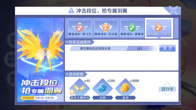 进行排位赛冲段,从练习生到音乐家,每进阶一个段位都可以获得奖励哦。