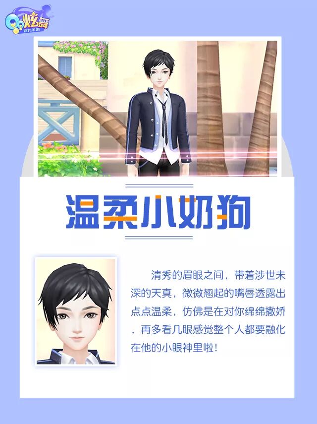 欸?怎么dancer们都一副精神不振的样子?是不是因为周一到啦!星瞳可是精神得不得了,因为......⁄(⁄ ⁄•⁄ω⁄•⁄ ⁄)⁄ ↓↓↓ 最近有不少精致的猪猪男孩纷纷表示:人家想要 男孩纸的美颜美妆教程 ~ 星瞳肿么忍心拒绝你们的要求(其实人家也想看可爱的蓝孩纸),所以这一次给大家带来了 可爱撩人的小奶狗小狼狗妆 ! 这么可爱,一定是蓝孩纸! 蓝宝宝们都get到妆容要点了吗?(认真脸)不过想要偷懒的dancer也可以将它们直接 导入美颜社中使用 哦~ << 滑动查看下一张图片 >> 点开上方大图 长按保存到手机相册 ,进入 游戏内美颜社 ,点击 导入脸型 将保存的图片上传就能够直接使用保存的妆容了!