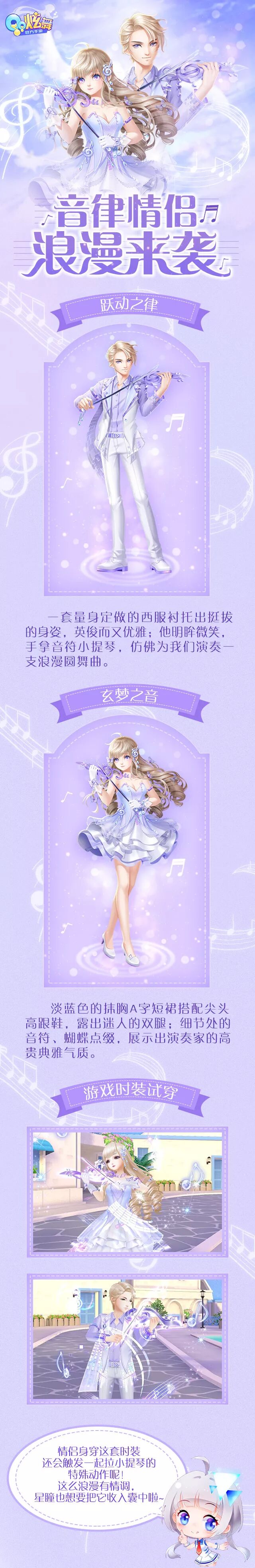 终于放假啦, 星瞳 约了 小胖6一起去郊外踏青,不然66都要胖成球咯~ 那dancer们呢?假期是来一场甜蜜蜜的约会?还是和炫舞世界的那个ta畅游社区秀恩爱? 说到这儿,星瞳有一套新时装能给你们的爱情加点猛料! 首款情侣 特效套 装 将在明天上架,自带演奏效果,让你们 成为蒂花之秀就是这么简单 !快来看看吧~ 这么精美的时装还带有动效?!看着这位妙龄少女 优雅地 演奏小提琴,音效环绕,真是赏心悦目呀! 不过既然是 首款情侣特效 时装 ,就少不了 专属恩爱特技 啦!已经 完婚的眷侣们两人站在一起 ,blingbling的音符旋律环绕着,就能 共同演奏 出 浪漫 动人的小提琴曲呢! 唯美温馨的场面,看得人真羡慕!单身的dancer也不要沮丧!这还有一套 异域风情装 ,相信你们看了也会欣喜若狂哒~ 以上这两套新时装都 将会在 明天上架超时空极光 哦!喜欢的dancer一定不要错过啦,赶紧把它们收入囊中吧~ 看完这两套新时装 , dancer们 是不是也很想谈个恋爱,穿上美美哒时装去约会啦?春天 果然 就是容易让人春心萌动呢! 在公众号菜单栏发送关键词: 音律情侣 获取精美的高清时装海报! dancer们,你们 还想 在炫舞世界 穿什么样的情侣装 呢?快来 【写留言】 告诉星瞳呀~星瞳也很想知道呢! 专属福利上新品 绑定账号 :绑定游戏账号,即可获得超值绑定礼包! 每日签到 :每天来签到,金币、点券、水晶礼盒等多种大礼等着你们哦!累计签到奖励更丰厚! 积分任务 :每天完成任务攒积分,就能兑换多种惊喜CDK大礼哦~只要坚持不懈, YSL口红 也能免费带回家! 积分商城更新商品咯~奖品数量有限,不想错过就赶快来兑换吧! 来源:QQ炫舞手游 阅读原文