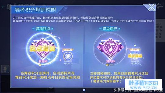 另外 QQ 炫舞手游排位赛每局参与的玩家,还可以获得一定的舞者积分,舞者积分 = 无挂机奖励 +x 连胜奖励 + 对局排位奖励。当玩家的舞者积分涨满时,自动消耗所有的舞者积分,增加一颗盛典并获得宝箱奖励。