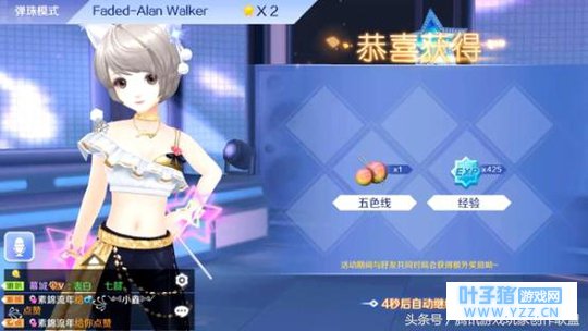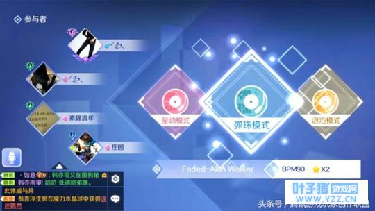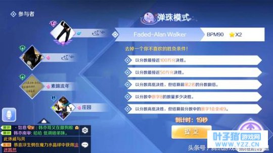 图2: 自动分配模式和歌曲 欢乐局匹配完毕后系统会自动挑选音符模式,其中包括星动模式、弹珠模式、泡泡模式三种,并且系统还会自动挑选比赛歌曲。欢乐局中想要取得好成绩,推荐将事务所中所有模式歌曲完成S通关,这样可以加深对歌曲的了解程度。