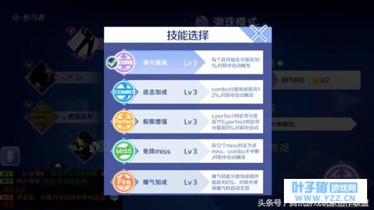 图4: 欢乐 局 技能选择 欢乐局玩家也可以自由选择携带技能,技能选择可以根据胜负条件来选择。如果这里产生最终胜负条件为上图最接近 50万分决胜,再结合歌曲Faded的难度星级只有2星,在ALL COMBO的情况下大概只能获得46万分 左右,这里推荐技能选择携带极限增强会比较好,它可以帮助我们更好的达到胜利条件。欢乐局不仅需要玩家拥有音符敲击技术,对歌曲的了解程度也是获胜的重要因素。
