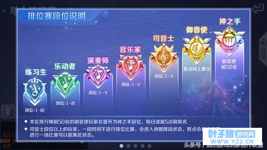 图 2:单人排位赛段位说明 排位赛的玩法很好的兼顾了自由度和公平性,玩家进入比赛后会在弹珠模式、泡泡模式、星动模式三种中,随机抽选一种作为比赛使用模式,随后系统会自动给出 6首歌曲,参与排位赛的4名玩家可以各去掉自己不喜欢的一首歌,最后系统随机从剩余的2首歌中挑选一首作为比赛使用歌曲。