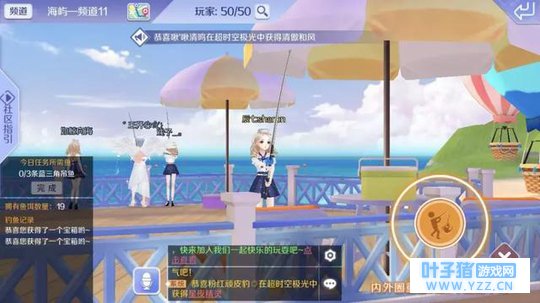 游戏中的“Show Time”, 倘若达到AC、AP,更有明显的光环标注 为了符合游戏“音舞”的特质,构建房间的组队比赛乃至舞团中,都加入了可以真实语音演唱的形式,用户可以通过下载伴奏实现类似KTV的即时演唱。 值得一提的是,在游戏社区系统中,除了玩家之间可以自由移动、自由沟通,还可通过特定外观道具实现飞行动作,进一步展示自己。 同时,游戏在大地图下更设置了明确的地图指引与活动任务指引,通过消耗任务等关卡获取的相应物资奖励,可以进行钓鱼、祈愿、挖宝等多重玩法,在不用付费的前提下获取更多外观与成就称号。这样一来,通过不乏乐趣的休闲游戏与可观效益,则更容易引导年轻女性用户转化为游戏玩家,又不会因为游戏鄙视链产生畏难情绪。