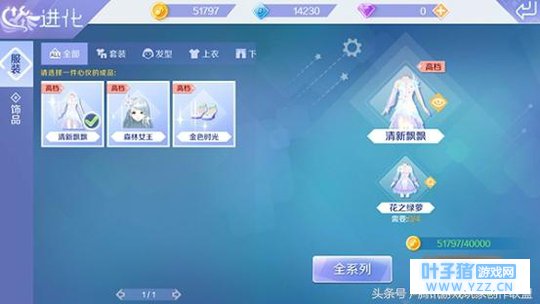 图 3 : QQ炫舞手游工坊服饰进化 这里玩家要可要注意了,舞团的神秘小店中出手的服饰,是可以在工坊中升级进化的,进化之后的服饰会获得外观的上的提升。如上图,玩家在神秘商店中可以用舞团币购买服饰花之绿萝,当数量达到 4件之后就可以在工坊中将 花之绿萝进化为清新飘飘。
