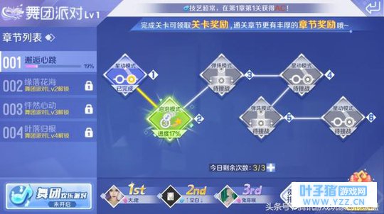 舞团派对是一种关卡挑战玩法,每天可以参加 3 次。每局挑战都可以获得对局奖励,在对局里的表现评价越高,获得的奖励就越好。完成关卡后还可以获得关卡奖励,而在通关章节以后更有丰富的章节奖励。除了舞团币和金币各种奖励,还有舞团贡献度奖励。所以,如果你想和小伙伴们一起建设舞团,每日得到舞团派对一定要记得参加哦。