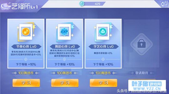签到和舞团商店的作用我们都了解了,那么艺修所有什么用呢?玩家在进入艺修所后可以学习一些技能;目前可以学习的包括节奏心得、舞蹈心得、学艺心得,通过提升艺修所和技能等级,可以在对战中获得更多的金币、经验和舞团币等的加成;这样的免费 BUFF ,大家千万要记得研修学习哦。