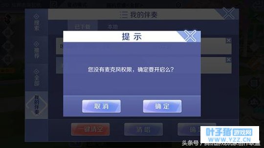 图 5 : 打开手机麦克风权限 休闲大厅玩家在房间成功下载歌曲后,在我的伴奏中点击清唱即可开始K歌,这里需要注意清唱K歌需要打开麦克风权限,不同的手机麦克风权限的位置不一样,玩家需要根据手机自己开启。成功打开麦克风权限后,玩家就可以在休闲大厅的房间中进行清唱K歌。 |