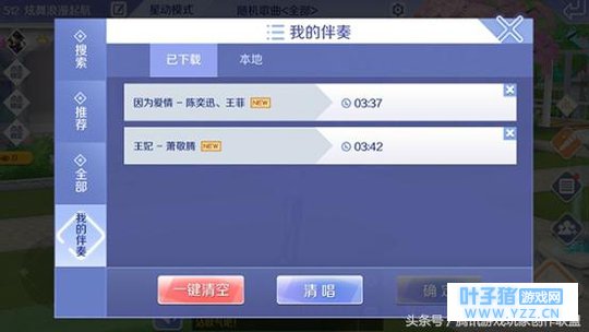 图 4 : 下载歌曲伴奏 打开K歌按钮后可以看到大量的歌曲,K歌首先需要玩家下载歌曲伴奏,成功下载伴奏就会出现在我的伴奏列表中。歌曲伴奏分为系统推荐、新歌、排行榜,另外还支持玩家使用本地伴奏。
