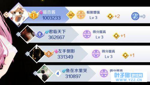 虽然每个人的水平不同,但是分数差距几倍已经不能以技术来解释了。并且下面三个人选的技能一致,分数相差也不大,所以“极限增强”的强力可见一斑。 如果是双人排位赛,推荐“极限增强”和“爆气加成”,这两个技能各有优势。极限增强是在整个过程中你都可以得到收益,爆气加成是要你自己看准时机,在某个节奏密集的时间段开启,集中爆发。