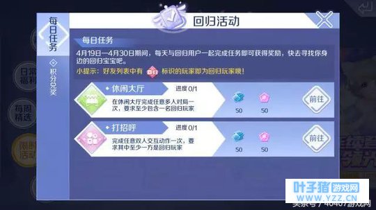 这么多新活动来袭,当然要和基友一起玩才带感! 在4月19日-4月30日期间,召唤自己的小伙伴回归炫舞,就能获得点券奖励哦~ 在【活动中心-限时活动-召唤老朋友】里面就能邀请久未回归的好友啦! 除了点券以外,和回归伙伴同玩游戏还有更丰厚的奖励呢!完成每日任务,就能够获取点券和回归积分~ 而这些积分都是能够兑换大礼包哒!(偷偷告诉你们,里面可是隐藏了不少的时装哦~)