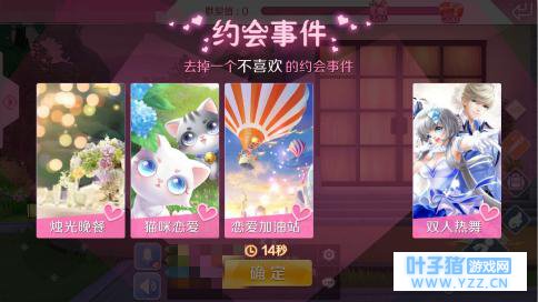 事件随机 进入约会房间后 系统随机给出5个 ,双方分别 选择一个不喜欢 的,就可以玩小游戏拉,每个事件根据结果有不同的默契值, 最高为100 ,最后 总分达到200分 则可以得到 最终奖励 ,有服装或者名片装饰等