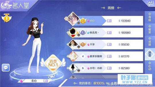 第四个领域则是消费,主要以消费积分作为判断依据,如果你想和 “ 土豪 ” 做朋友的话,来排行榜的消费项上找好友,准没有错哦!如果你觉得消费榜太难进入,可以考虑下赞数榜和收花榜,多与好友互动、互赞、互送,相信排行榜总会有你一席之地的哦!