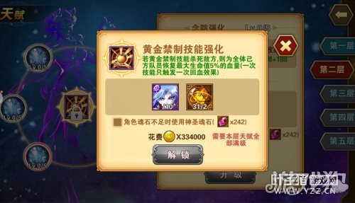 那么,开启天赋后,又该如何升级呢?这时候你需要摸一摸腰包了,因为升级天赋需要消耗魂石和金币才能进行。游戏中天赋由六个小的属性天赋和一个中间的主要天赋组成,只有当六个属性全部解锁完成之后,才能开启中心的主要天赋。