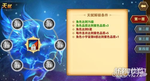 首先,小编先带大家了解一下天赋系统。在游戏中,并不是所有角色都能开放天赋系统的,玩家必须要达到75级,角色培养至五星,角色品质紫色+3、圣衣品质紫色+5,同时小宇宙第6感需达到紫色品质。这还只是第一层的开启条件,随着天赋层数的增加,需要解锁的条件也会越来越高哦。虽然看起来条件很苛刻,但追求无上的战力本身就是一种乐趣嘛~况且只有激活天赋之后,你才会知道它对你的角色属性有多大的帮助!