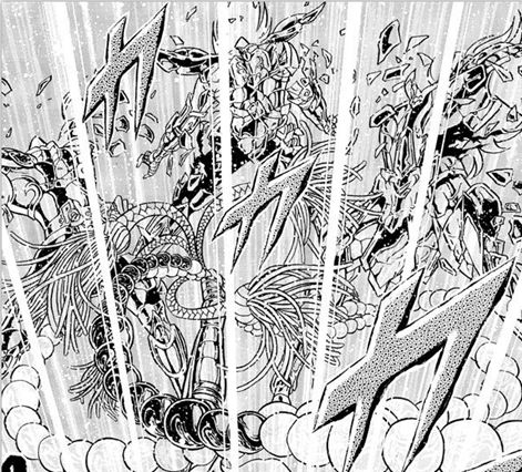 沙加是有大智慧的智者,绝不会凭一腔热血去做无谓的战斗,他知道实力接近的对决,先手大招很重要。于是趁三人不备,直接使出最强奥义 天舞宝轮 。