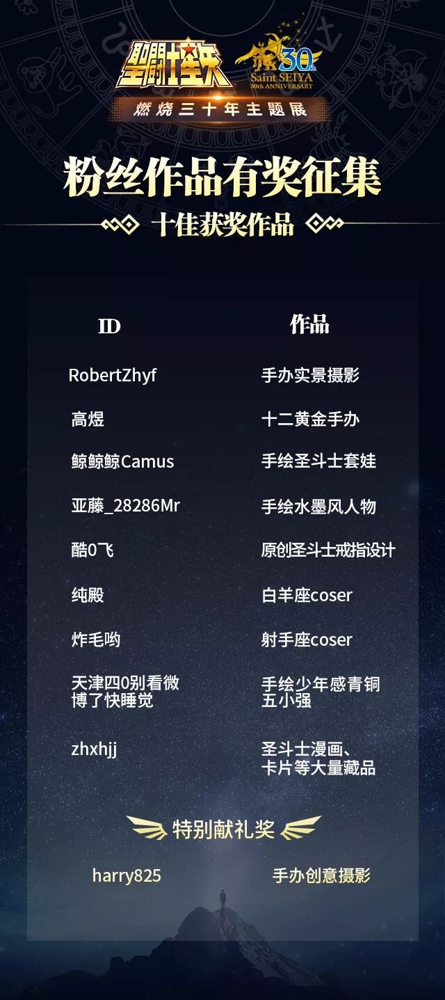 圣斗士星矢 · 燃烧30年主题展 粉丝作品有奖征集 在大家的猛力支持下 华丽丽的评出了结果 话不多说,先晒名单 ↓ ↓