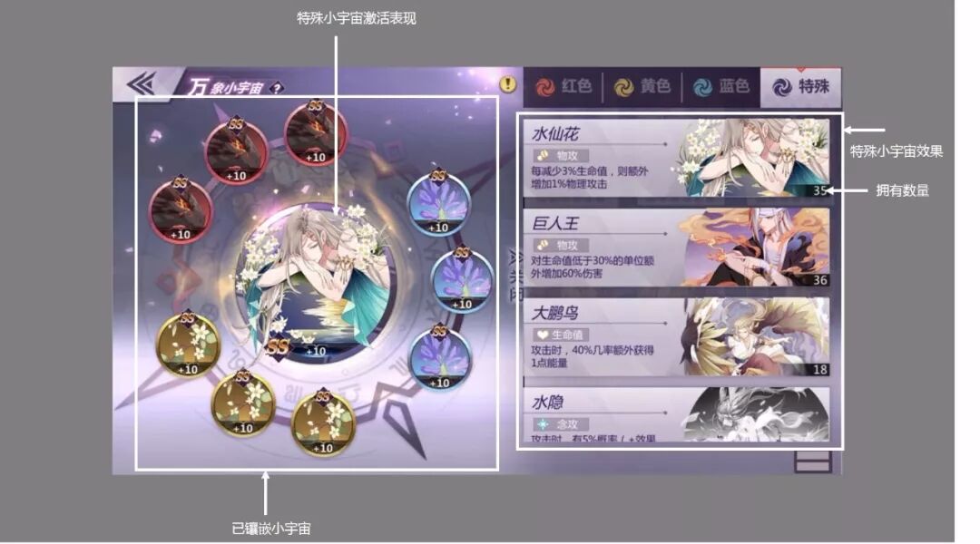 3 小宇宙属性分类及效果激活 红色小宇宙 主属性是提升卡牌输出及少量防御; 黄色小宇宙 主属性是提升卡牌防御和生命; 蓝色小宇宙 主属性是提升卡牌生命型、速度、以及命中; 特殊小宇宙 除了有主属性外,还额外附带一个战斗中的效果!