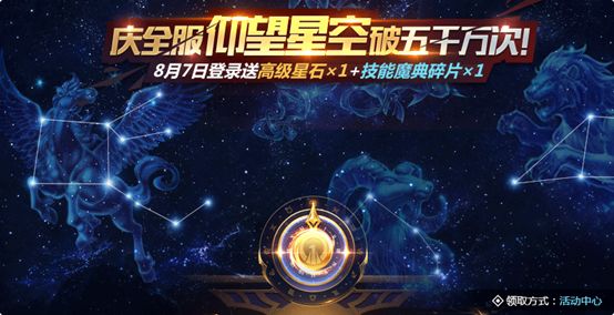 为了庆祝全服累计召唤破 5000W 次,为了回馈玩家们的热情,特意准备了新的登录回馈活动,登录就送 高级星石和技能魔典碎片 ,大家千万别错过啦~ ( 仅限8 月7日当天登录,在活动中心领取 )