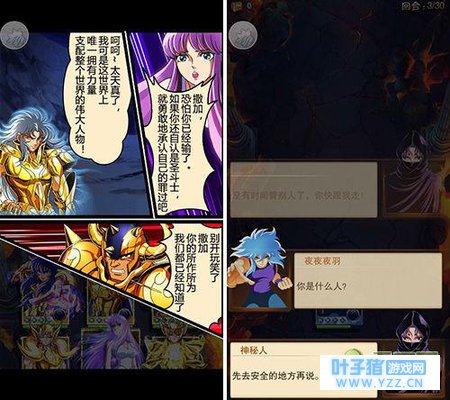 游戏一开始选择了男/女主角之后就要开始冒险了,大致剧情讲述的是主角的村子被烧毁了,然后被神秘人搭救继而结识了青铜五小强等一群人按照原著开始发展剧情,这里不得不提到剧情的表达方式,首先对话方面有一种似曾相识的感觉,喂,你们这样聊微信真的好么?其次是主线剧情都以漫画形式表现,人物100%还原,而且还是全彩!全彩!不得不说策划和美工真心给力,我们是冲着动漫而来,他们便以动漫的形式来表现,又要热泪盈眶了有木有。