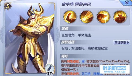 NO.3金牛座阿鲁迪巴 老牛是真的逆袭了,他有连个输出方式,一个是直接输出,280%同时提高双防增加生存能力。第二个是通过蓄力来增加伤害,两个单体输出效果都很强悍,属于攻防一体的类型,论生存轮输出都是S级黄金中首屈一指的存在。
