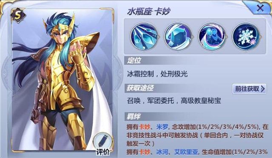 水瓶座·卡妙 双冰队控制核心,和冰河使用。目前竞技场中,同时用偷火流和双冰队的比较多,也比较难克制。 推荐阵容:卡妙、冰河、海魔兽、星矢、猎犬座、卡妙(狮子座) 双鱼座·阿布罗狄 以不怕沉默,溢出能量转化成伤害而受欢迎,出场率很高。 推荐阵容:阿布罗狄、枫、狮子座
