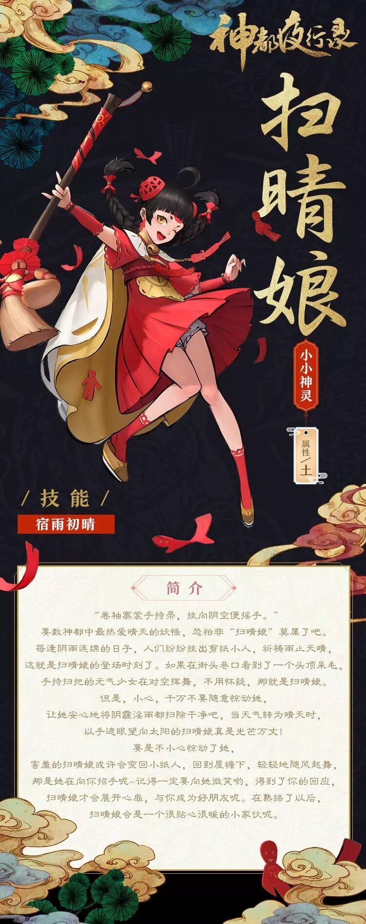 在设计扫晴娘的形象时,主要从古时候人们对于好天气的向往期待出发,人们会剪纸人祈祷晴天,大家的信仰就催生出了满含信仰的力量的扫晴娘,这么有朝气的妖灵,当然会是一个可爱的妹子啦~ 这个妖灵不但有取材于民间扫晴娘剪纸形象的扫帚,在她的衣饰上,也可以看到传统的剪纸元素哦~