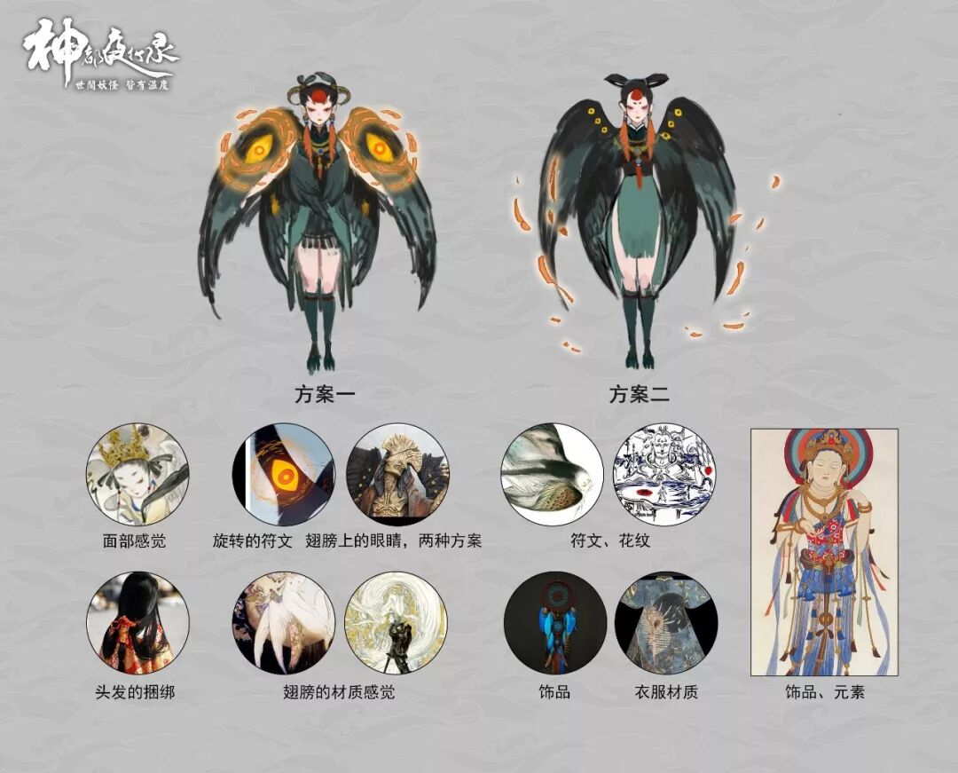 于是,《山海经·北次二经》中的上古妖族的妖灵—— 酸与 ,成了他的下一个目标。 酸与是会带来恐慌的上古妖族,在传说中,酸与还是有四只翅膀、六只眼睛、三只脚的怪鸟。 嗯,恐慌……结合一下传说中的元素,那在翅膀上安上睁大的眼睛一定会增加这种感觉。 说干就干, 聂 少一口气做出了两种翅膀安眼睛的方案。
