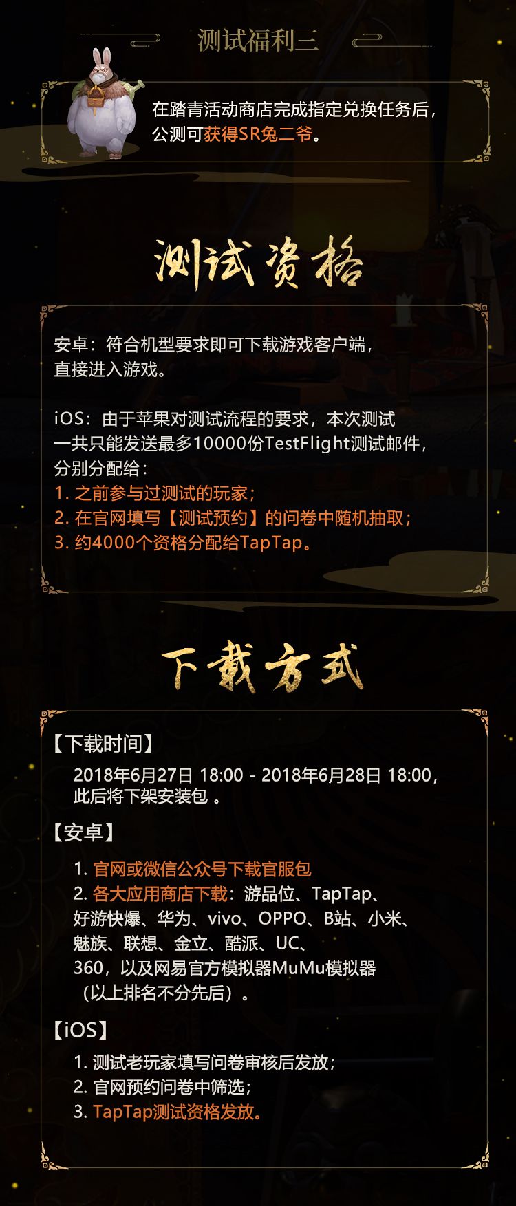 为了给大家提供完整的八天测试体验(保证各位大人能拿满测试登录奖励) ,请尽快尽快尽快完成下载 , 下载将于 2018年6月28日 18:00 关闭 。