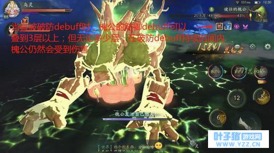 [副本机制]槐公每受到一段妖灵技能伤害时,防御增加30%,持续20秒 [难度评级]简单 [解读]若槐公身上没有被破防debuff,当受到3段伤害以上的妖灵技能攻击时,槐公便会由于防御叠加变成100%免伤状态,不会再受到攻击伤害,持续20秒;当槐公身上有被破防debuff时,则无论防御buff层数有多高,均会受到伤害。 [应对思路] 一、使用能够破防的妖灵,例如: 兔二爷,一定时间内降低boss防御。兔二爷的破防会在boss的防御属性叠加之后额外最终结算,所以无论boss叠加了多少层防御,兔二爷都能减少boss总防御的额定百分比,无需担心妖灵攻击段数过高给boss叠加层数过多使boss进入100%免伤状态。推荐使用时机为输出妖灵妖气积攒完毕时,先使用兔二爷然后立刻使用输出妖灵,在破防debuff持续时间内打出伤害。