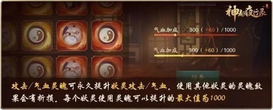 3.【灵契等级】每提升一级,可获取妖灵对应的攻击灵魄或气血灵魄,妖灵使用自己的灵魄可以永久提升攻击或气血。 (1)每个妖灵使用灵魄可以提升每种属性的最大值为1000。 (2)妖灵也可以使用其他妖灵的魂魄,但效果会有折损。 (3)妖灵用灵魄提升的攻击和气血是不会重置的,请大人们放心~