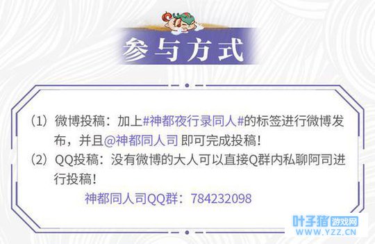 同人征集活动 在神都夜行录的世界里,想必玩家们都会有自己喜欢的妖灵,本次同人活动,将以“本命妖灵”为主题,进行创作。同人内容的形式上不做任何限制,画作、文字、视频剪辑等作品都可以投稿。关于参与方式见下图: